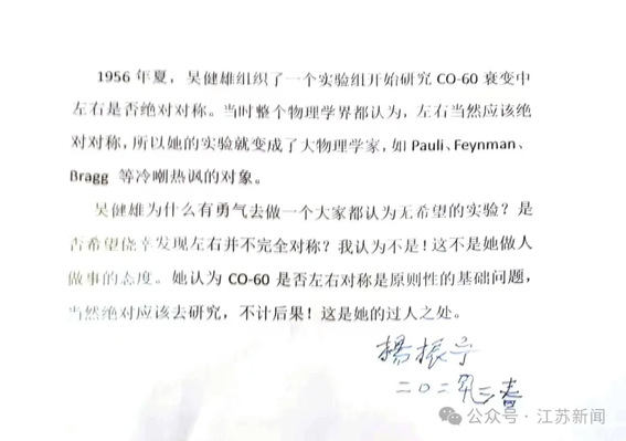 跨越時空的科學共鳴,在2022年東南大學120周年校慶暨吳健雄先生誕辰110周年之際,達到了一個新的高度。彼時已近期頤之年的楊先生,以最鄭重的方式——親筆撰文,來表達他的敬意。在這份珍貴手稿中,他深刻剖析了吳健雄在幾乎整個物理學界質疑面前,所展現出的“原則性的基礎問題,當然絕對應該去研究,不計后果!”的非凡勇氣與科學赤誠。這份由他簽名、并通過《物理科學的第一夫人:吳健雄》作者江才健轉贈東南大學的手稿,不僅是兩位物理學大師精神對話的絕佳見證,更是楊振寧先生給予東南大學最為厚重的禮物,其上所承載的求真精神與“止于至善”的校訓內核交相輝映。