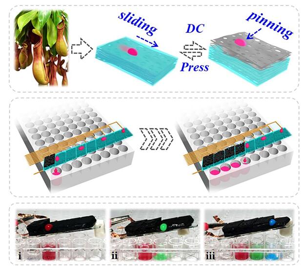 Functional materials with specific surface wettability play an important role in a wide variety of areas. Inspired by nature’s Nepenthes pitcher plant, they present a novel slippery film with tunable wettability based on a shape-memory graphene sponge. The porous graphene sponge coated with shape-memory polymer was used to lock in inert lubricants and construct slippery surfaces to repel different liquids. The superelasticity and high strength, together with good electrical conductivity, of the graphene sponge imparted the graphene/polymer hybrid films with fast recoverable shape-memory properties. Various droplets could slip on the compressed film with a lubricant-covered surface, but the droplets would be pinned when the shape-memory graphene film rebounded due to electrical stimulation, which caused the penetration of the infused lubricant into the pores and the exposure of rough topography film surfaces. The electrothermally dynamic tuning approach was stable and reversible; thus, the shape-memory graphene film was imparted with controlled slippery properties and functions that would be amenable to a variety of applications, such as liquid handling for microplates.