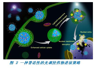 Research on nanomedicines has rapidly progressed in the past few years. However, due to the limited size of nuclear pores (9–12 nm), the nuclear membrane remains a difficult barrier to many nucleus-targeting agents. Here, the team report the development of a general platform to effectively deliver chemical compounds such as drug molecules or nanomaterials into cell nuclei. This platform consists of a polyamine-containing polyhedral oligomeric silsesquioxane (POSS) unit, a hydrophilic polyethylene glycol (PEG) chain, and the photosensitizer rose bengal (RB), which can self-assemble into nanoparticles (denoted as PPR NPs). Confocal fluorescence imaging showed that PPR NPs mainly located in lysosomes after cellular internalization. After mild light irradiation, however, PPR NPs effectively disrupted lysosomal structures by singlet oxygen (1O2) oxidation and substantially accumulated on nuclear membranes, which enabled further disruption of the membrane integrity and promoted their final nuclear entry. Next, the team selected two chemotherapeutic agents (10-hydroxycamptothecine and docetaxel) and a fluorescent dye (DiD) as payloads of PPR NPs and successfully demonstrated that this nanocarrier could efficiently deliver them into cell nuclei in a light-controlled manner. In addition to molecular compounds, the team have also demonstrated that PPR NPs could facilitate the nuclear entry of nanomaterials, including Prussian blue NPs as well as gold nanorods. Compared to traditional strategies for nuclear delivery, this highly controllable nanoplatform avoids complicated modification of nucleus-targeting ligands and is generally applicable to both molecular compounds and nanomaterials.