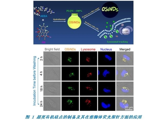 Recently, Prof. Wu Fugen of School of Biological Sciences and Medical Engineering of Southeast University and National Key Laboratory of Bioelectronics, cooperated with Prof. Chen Zhan of University of Michigan and synthesized ultrasmall and ultrabright organosilica nanodots with 100% photoluminescence quantum yield for the first time, and realized Long-Term Lysosome Imaging. Related results have been published in Nano Letters under the title of “One-Step Synthesis of Ultrasmall and Ultrabright Organosilica Nanodots with 100% Photoluminescence Quantum Yield: Long-Term Lysosome Imaging in Living, Fixed, and Permeabilized Cells”. The corresponding authors of the article are Prof. Wu Fugen and Prof. Chen Zhan. The first authors are SEU doctoral student Chen Xiaokai and Zhang Xiaodong.
