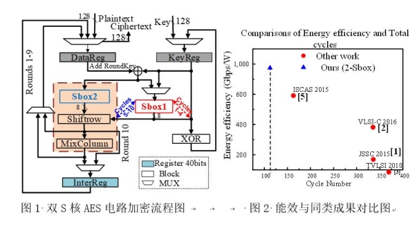 This circuit is taped out by TSMC 28nm CMOS process. The test results show that the energy efficiency of the AES circuit hereof reaches 923Gbps/W, which is the highest energy efficiency up to now, obviously superior than similar research results.