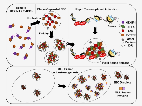 The research team of Southeast University revealed that SEC-mediated multivalent phase separation would play a key role in the transcription of RNA polymerase II and its release from the suspension state, and provide a new understanding of exploring the mechanism of rapid coordinated transcriptional activation of genes from a completely new perspective. In addition, the authors also found that the transposition and fusion of SEC and MLL genes in mixed lineage leukemia (MLL) can greatly promote the separation of SEC, thereby promoting the rapid transcription of oncogenes while maintaining high expressions. This discovery will provide a new direction for exploring the SEC-related human disease pathogenesis and the drug targeting screening options.